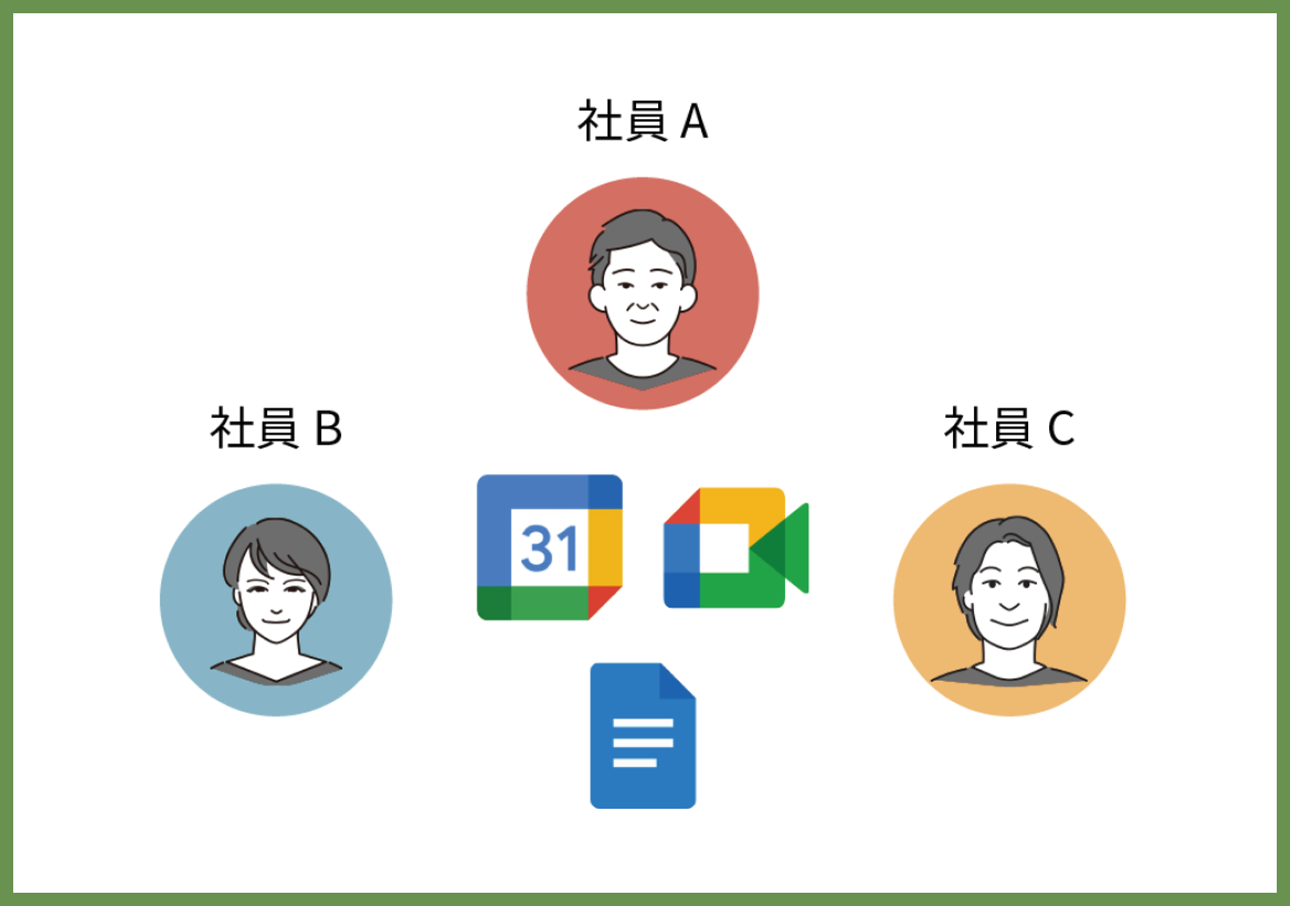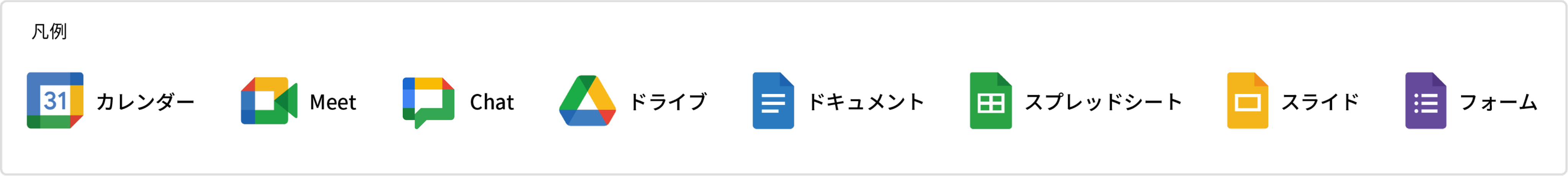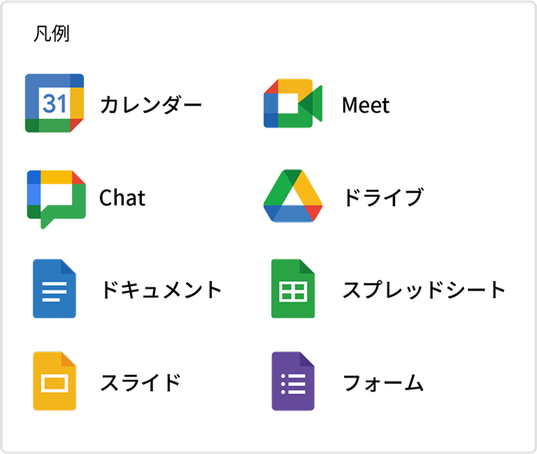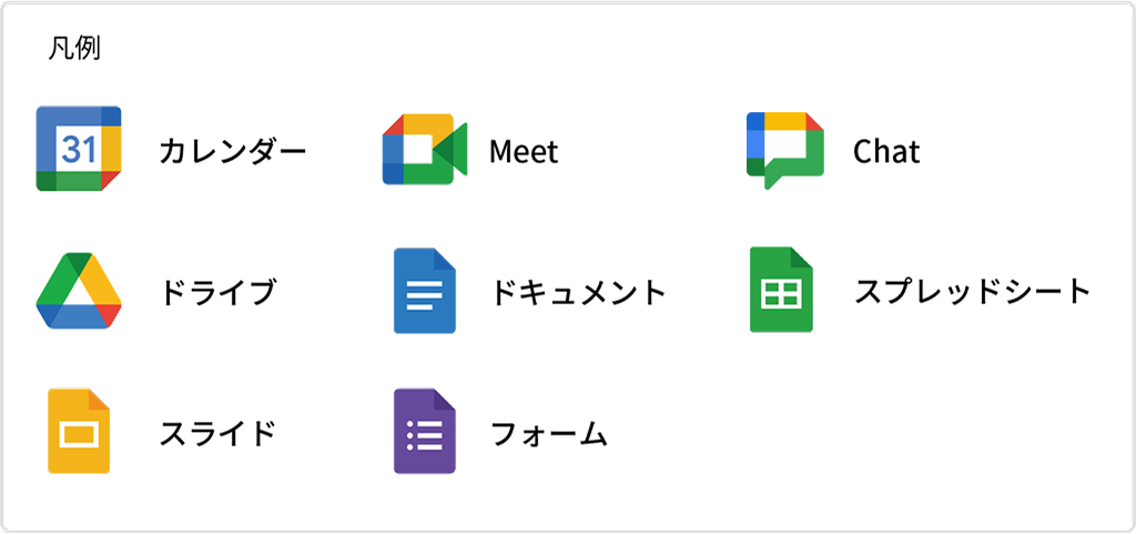 Gmail、カレンダー、ドライブ、ドキュメント、スプレッドシート、スライド、Meet、チャットなど、