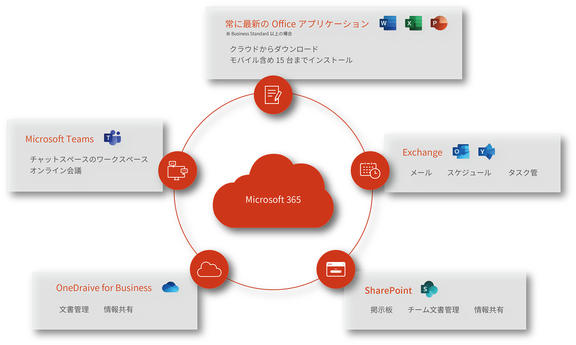 オンライン会議、チャット、共同編集、情報共有など、チームワークを強化する機能も備え、