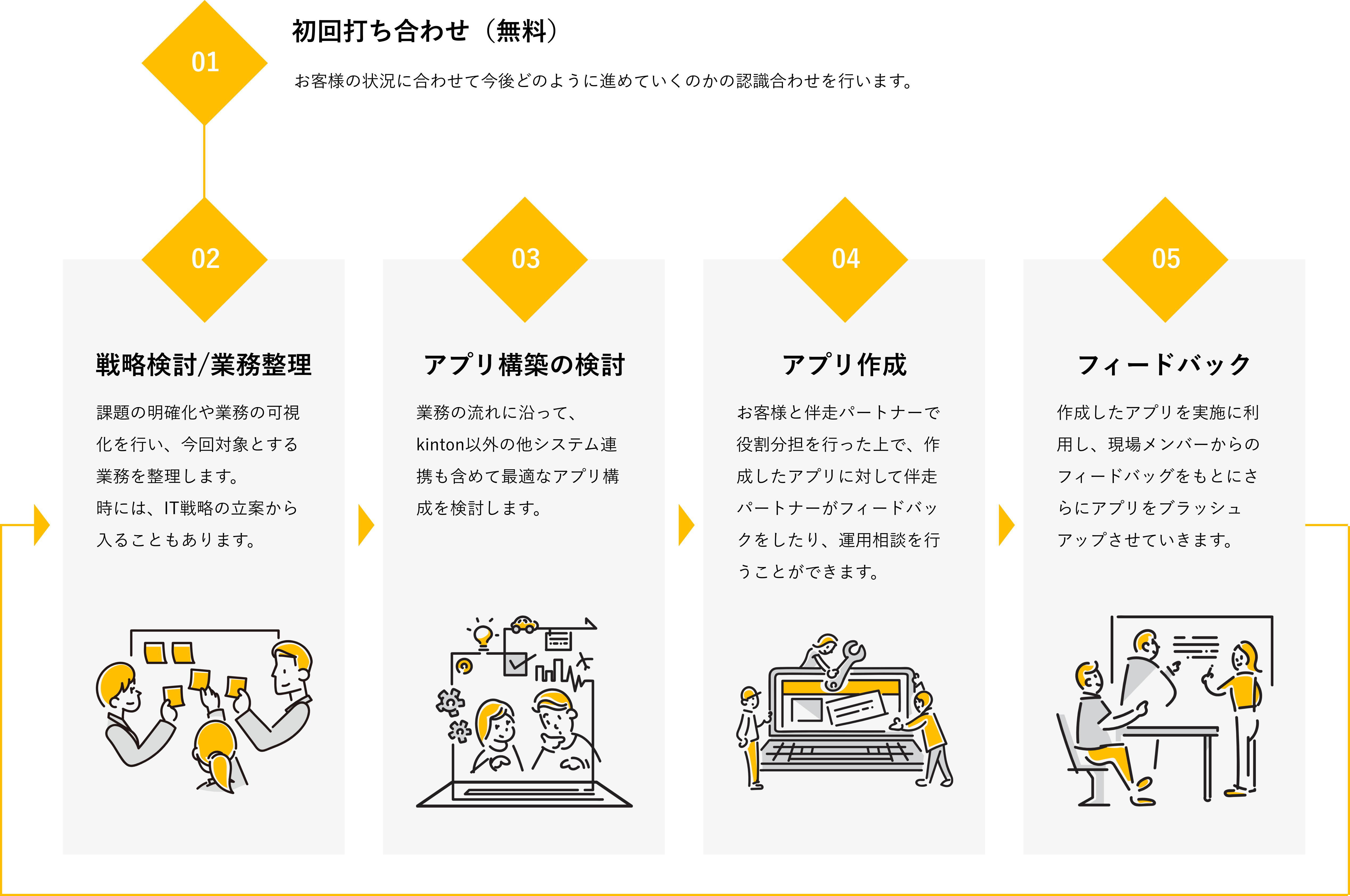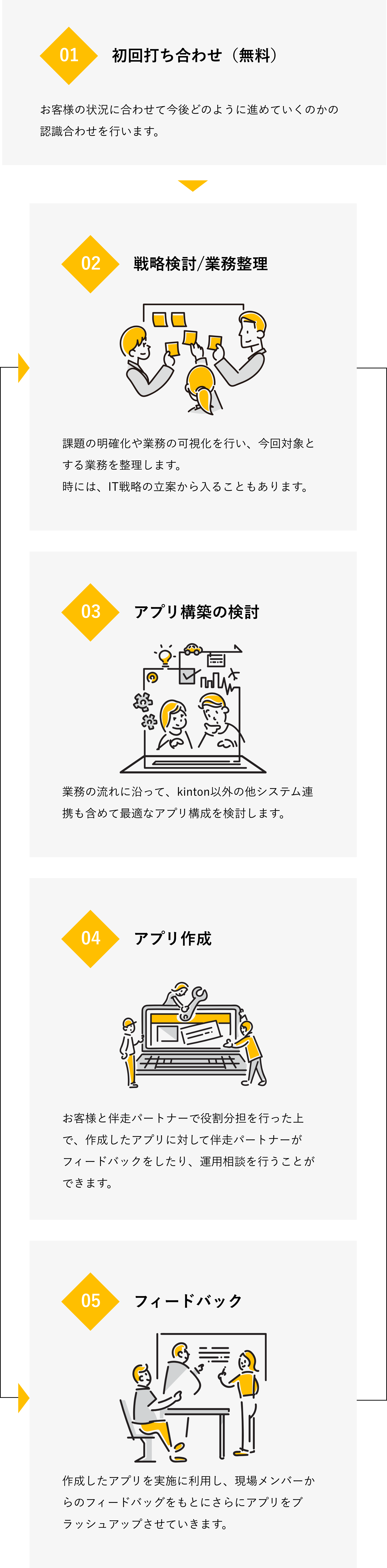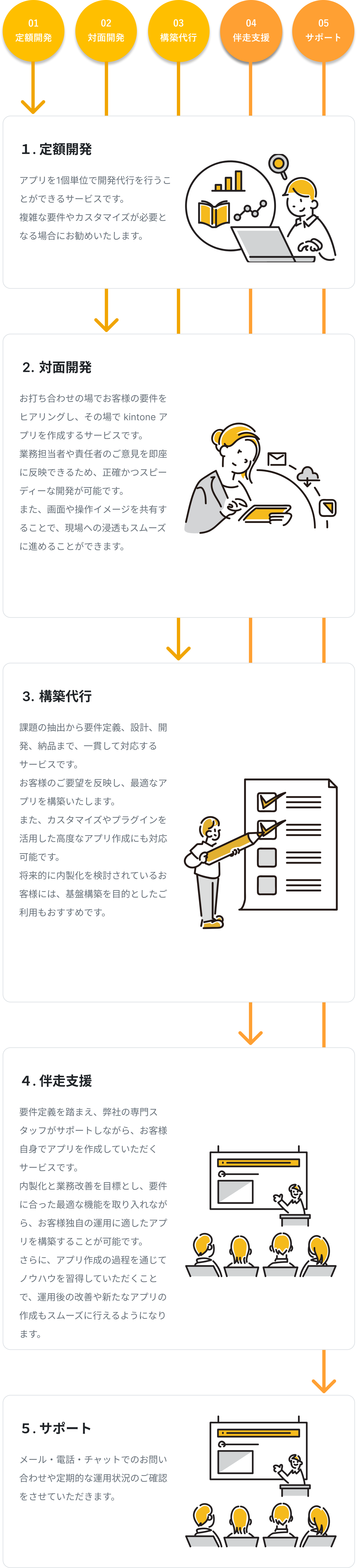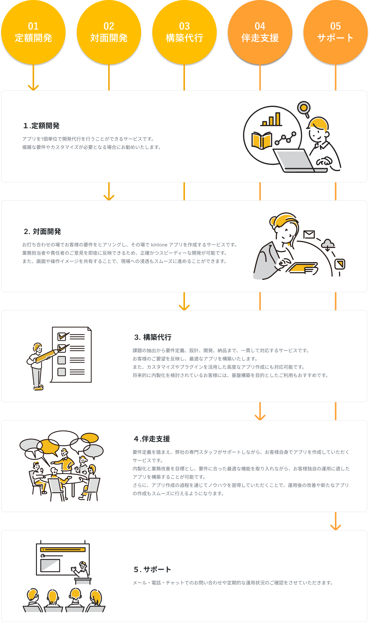 - ヒアリング、要件定義、アプリ設計、アプリ作成、カスタマイズ開発、プラグイン設定、フィードバック、研修